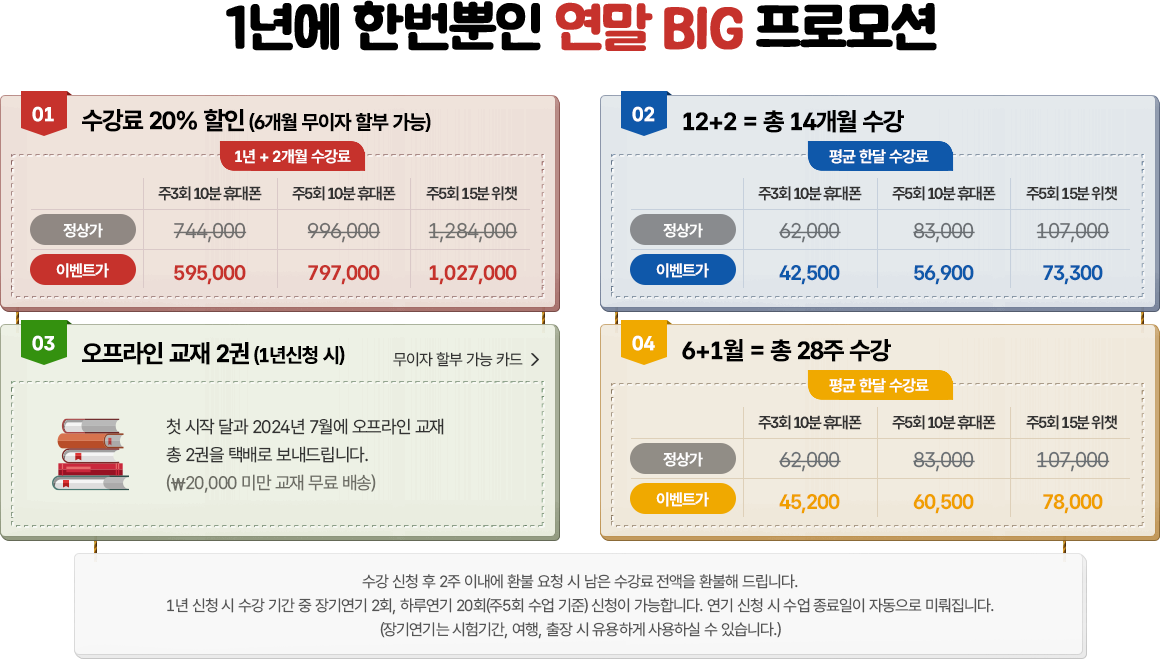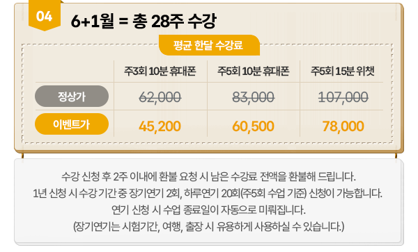 ※ 주3회, 주2회의 경우 혹은 20분 이상의 수업의 경우는 다른 기준으로 적용됩니다. 자세한 사항은 고객센터로 문의주시기 바랍니다.※ 소개를 받고 오신 회원님은 수강신청시 소개해준 회원님의 성함과 아이디를 알려주세요.