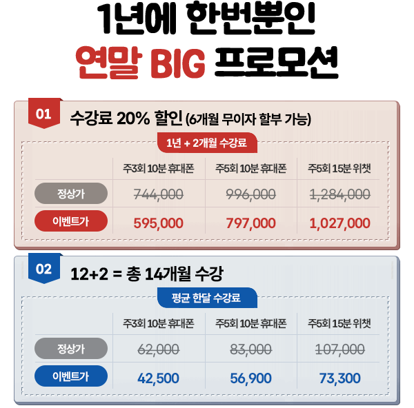 ※ 주3회, 주2회의 경우 혹은 20분 이상의 수업의 경우는 다른 기준으로 적용됩니다. 자세한 사항은 고객센터로 문의주시기 바랍니다.※ 소개를 받고 오신 회원님은 수강신청시 소개해준 회원님의 성함과 아이디를 알려주세요.